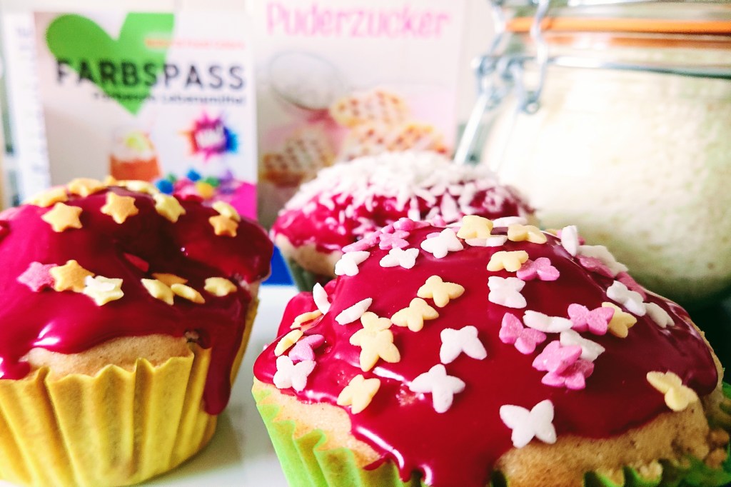 Für die Zuckerglasur Lebensmittelfarbe und Puderzucker mit wirklich wenig Wasser (oder Zitronensaft, wer mag) anrühren, bis eine zähe Masse entsteht. Wenn sie zu dünn ist, mehr Puderzucker oder Stärke einrühren. Auf die komplett abgekühlten Muffins verteilen, Dekokram draufstreuen und Geduld haben, bis das Zeug fest ist. Fertig, Geburtstag feiern!
