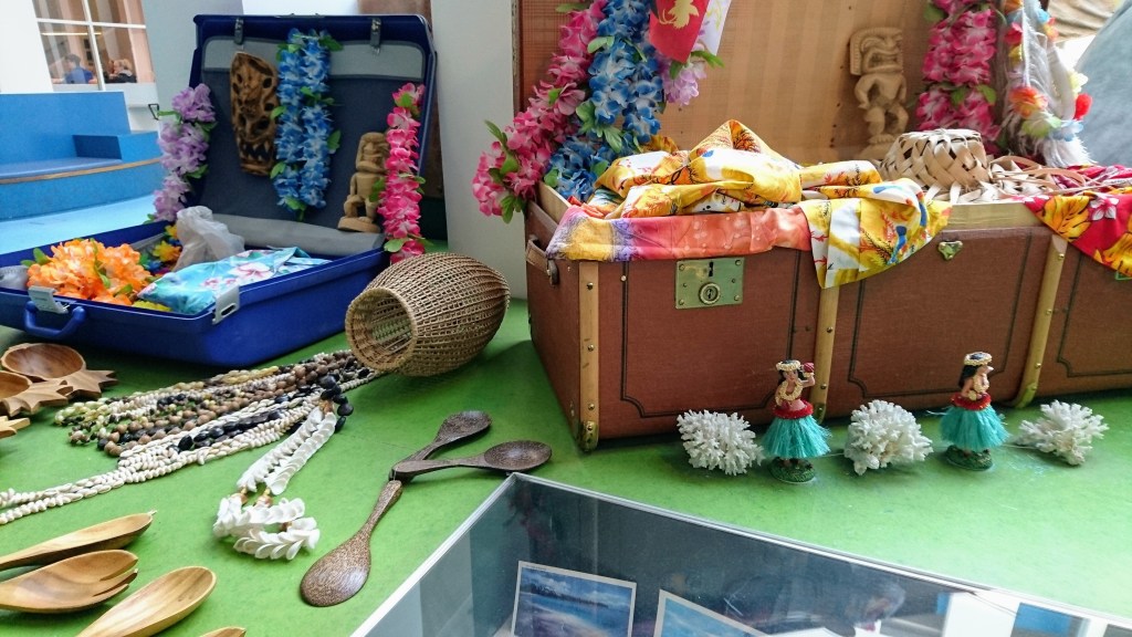 In einem anderen Stockwerk sehen wir »die Südsee im Koffer. Souvenirs sind ein greifbarer Beweis für den Aufenthalt an fremden Orten, mit denen der Reisende seine Träume und Erinnerungen festhalten will. Darüber hinaus soll das Mitbringsel der Zierde dienen und nützlich sein.« Schwarze Menschen tanzen in Bambusröcken auf vergilbten Urlaubspostkarten. Klischees, wohin man blickt.